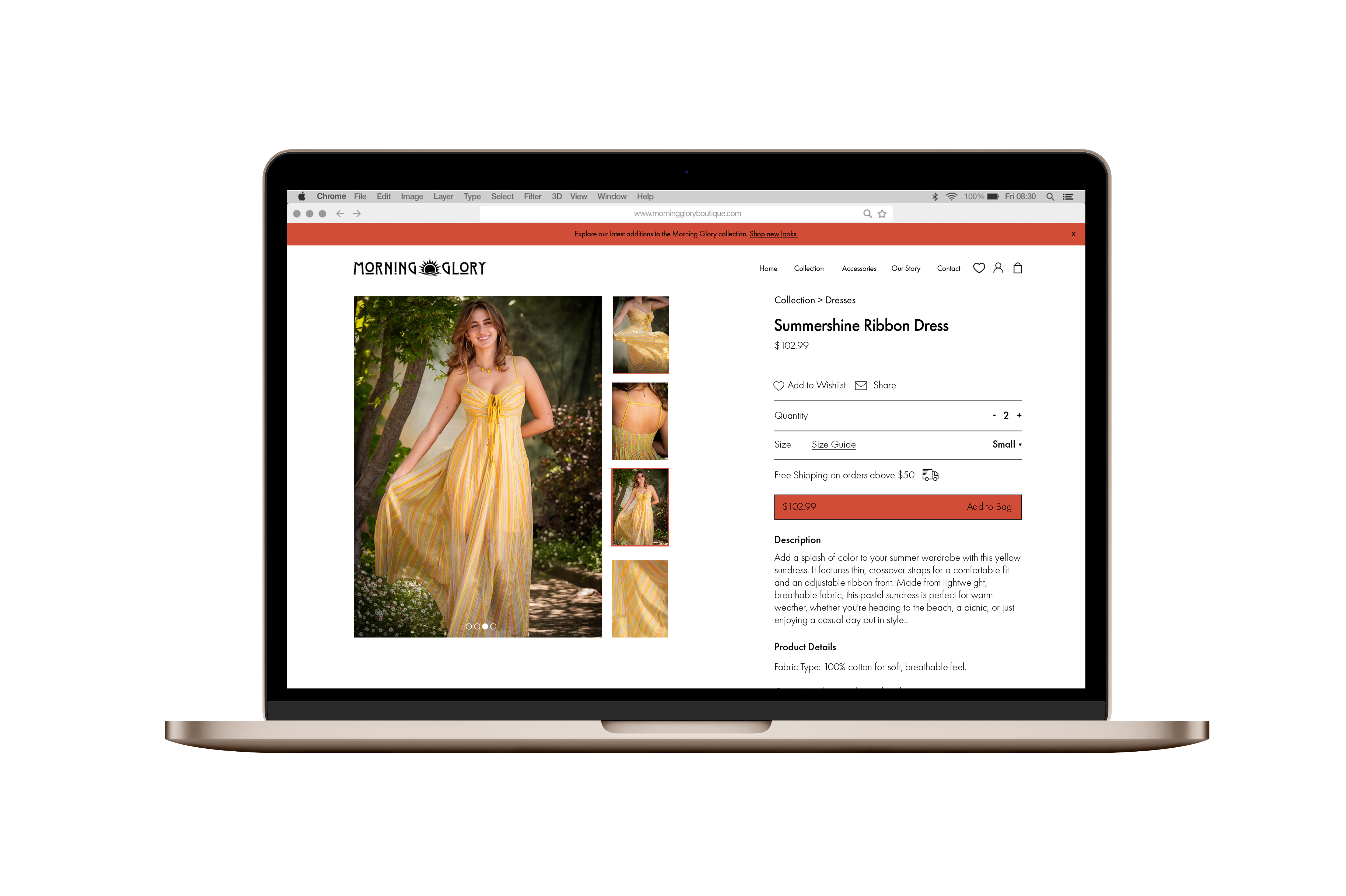 My approach is to modernize the brand while retaining its nostalgic charm, wanting to ensure that Morning Glory continues to attract both loyal customers and a new generation of shoppers. The updated design aims to strengthen the boutique’s image as a luxury destination, with a focus on becoming a recognized leader in the boutique space. Through color palette and typography changes, I wanted a touch of elegance in the website, logo, and brand overall, while reinforcing Morning Glory’s commitment to personalized, memorable shopping for every customer. As the foundation of their company, it’s important to tie their ideals to a modern approach to stay ahead of the fashion industry.