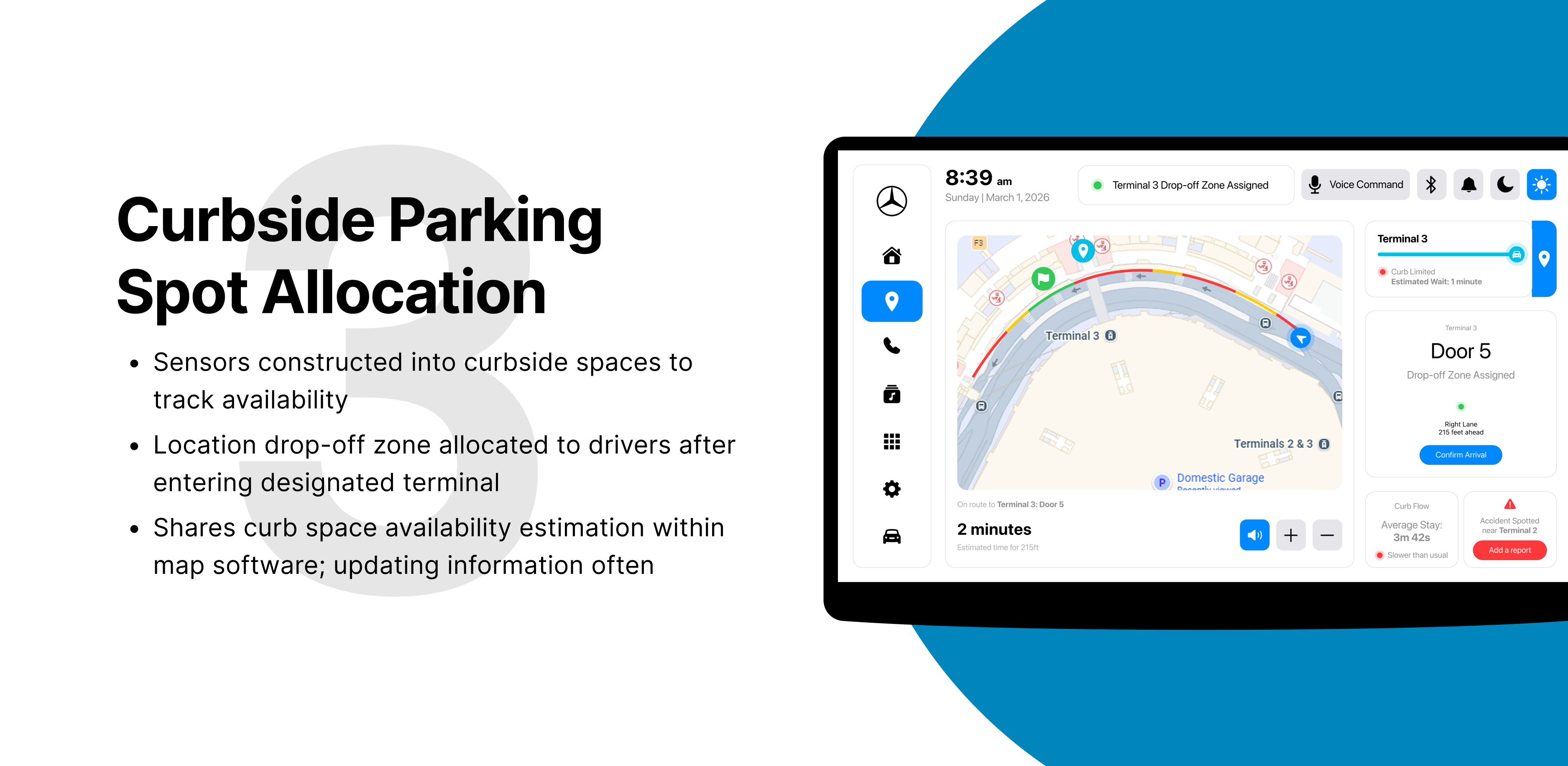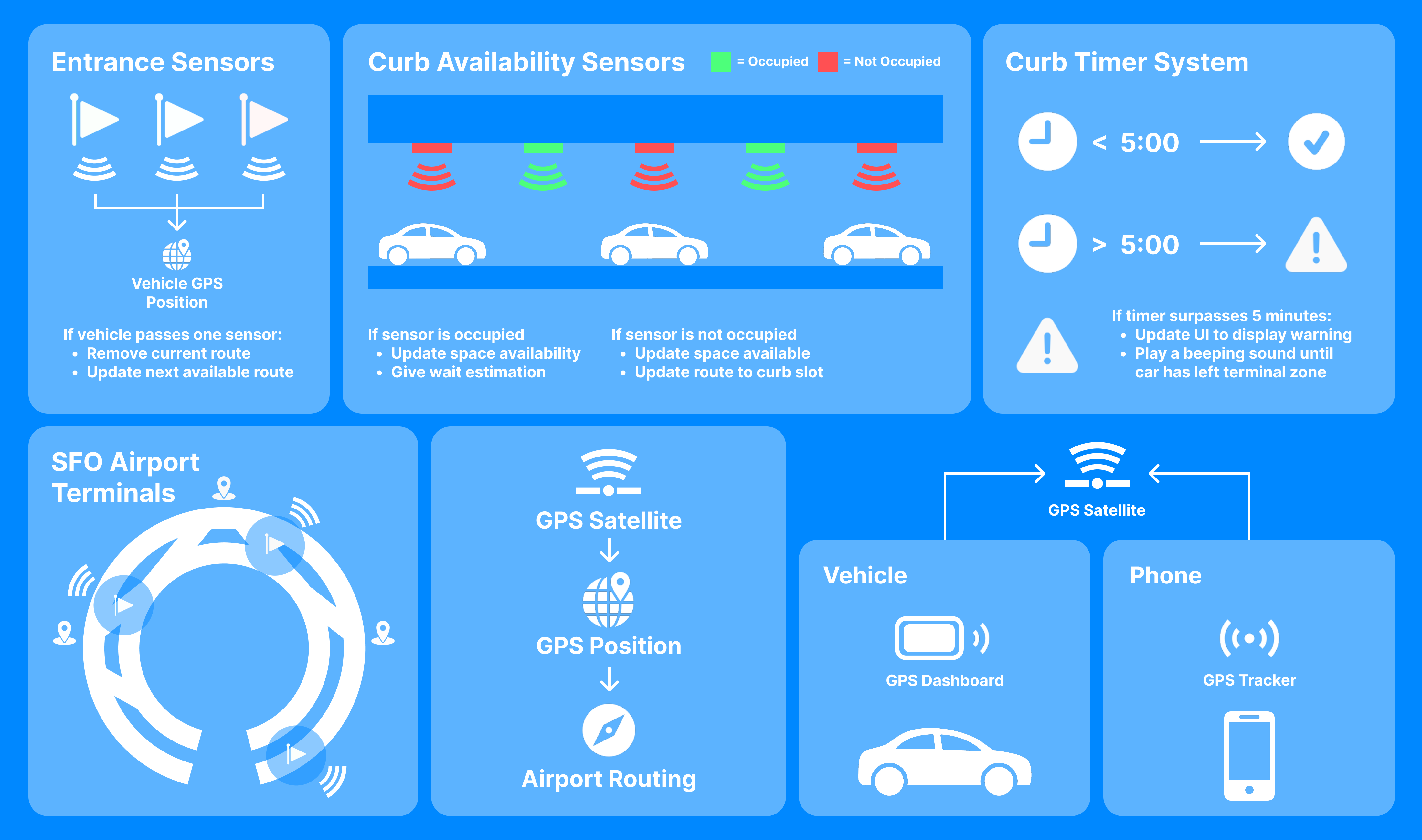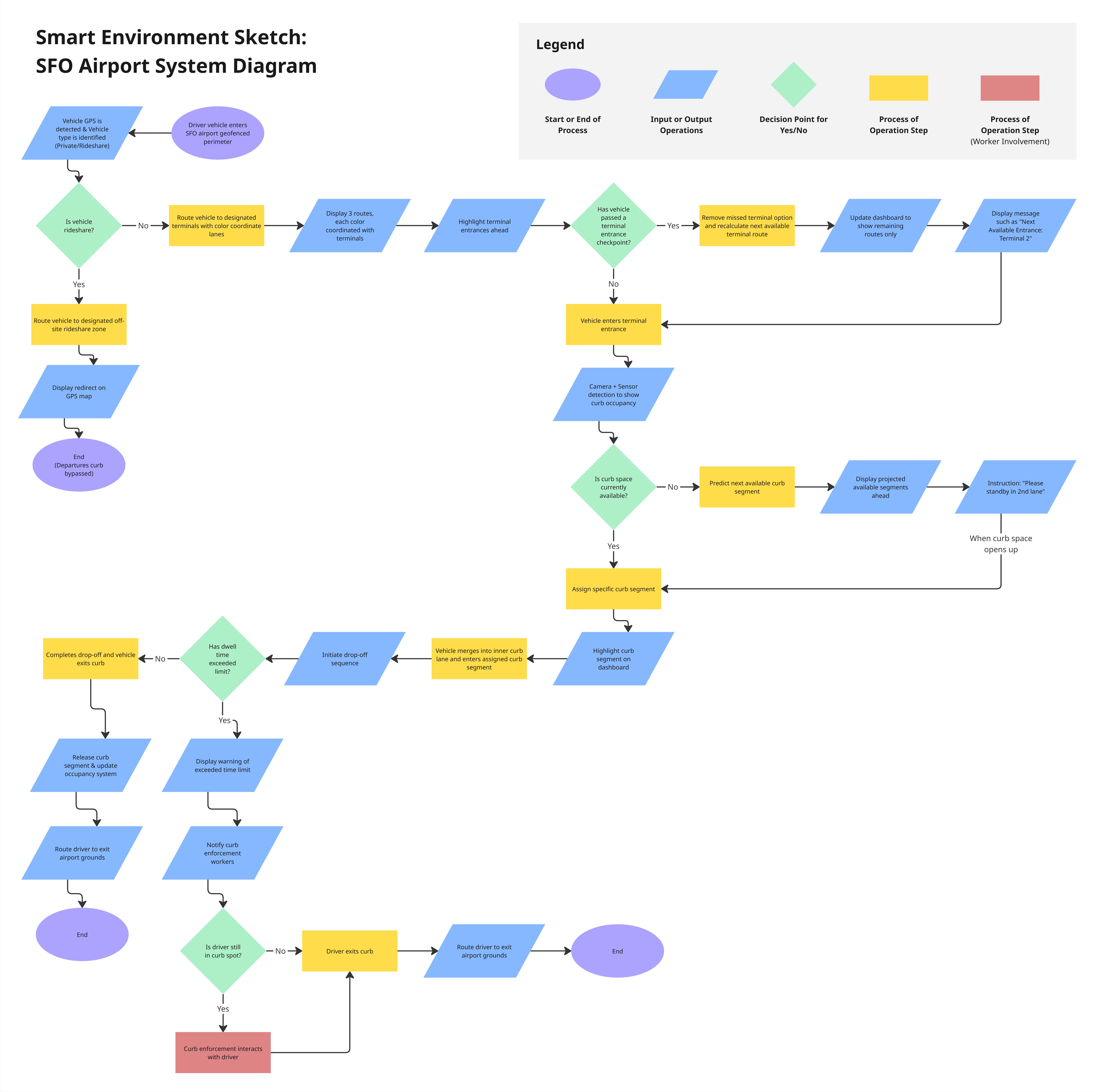 Covering three major groups of insights, I forged a system diagram of a potential solution system that would solve for multiple problems, including a seperate zone for rideshare services to not conflict with personal drivers. It creates decision points for the system to determine if a vehicle is near a terminal entrance point and if curb space is available. The system input and output operations change based on real-time data and I’ve added the potential involvement of ground traffic control workers in this new system.