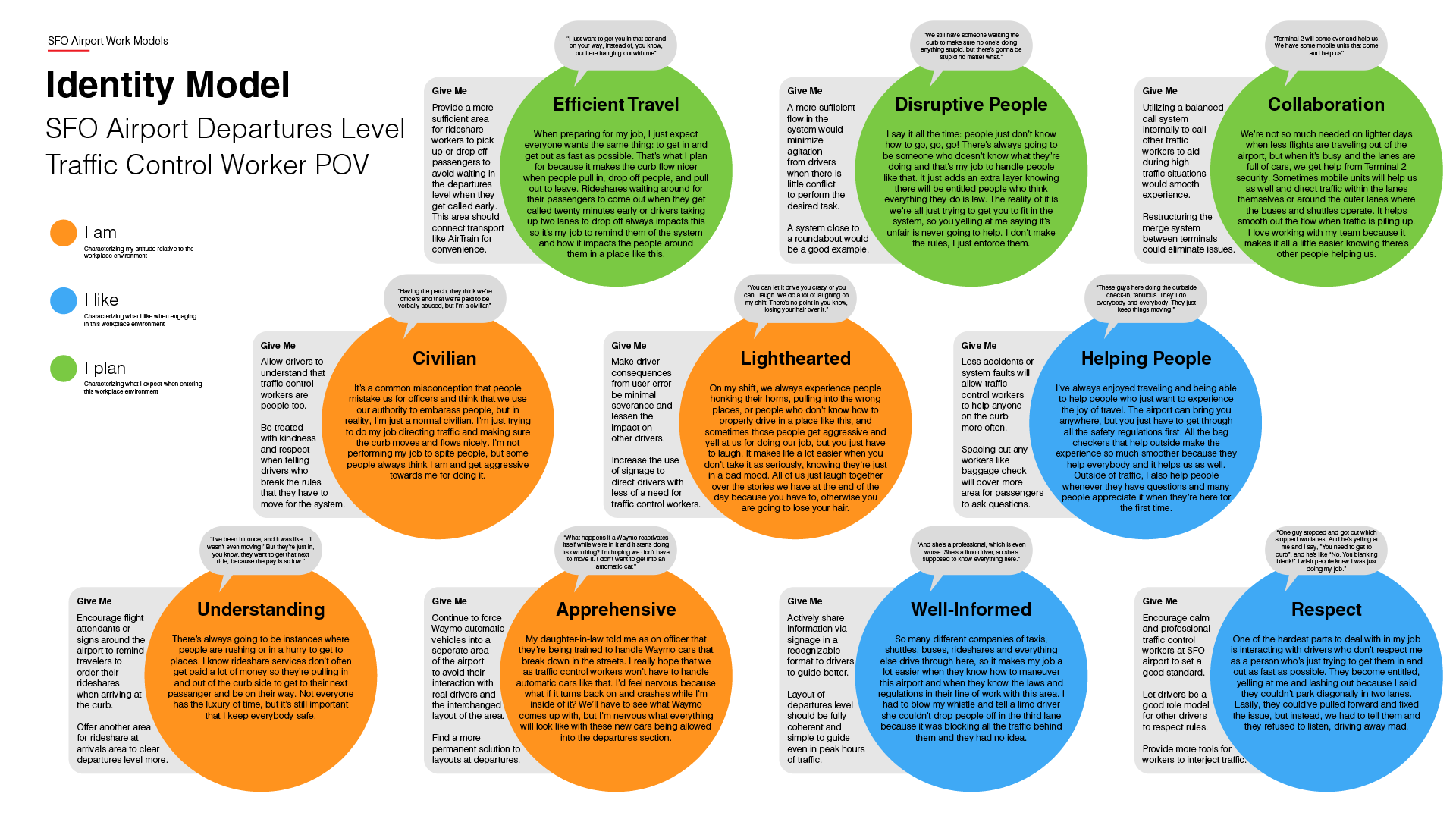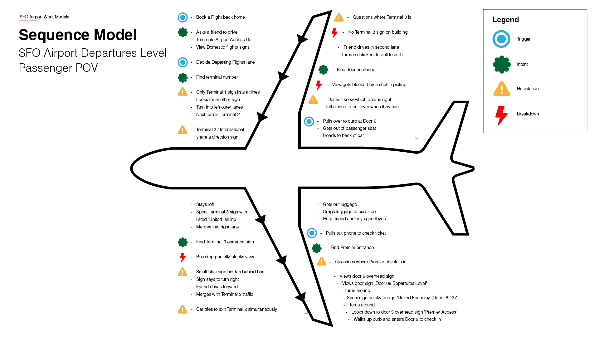 Visualizing three work models helped me grasp the perspective from: Passengers, Drivers, and Workers. A physical model laid the architectural system in front of me, mapping out each bus stop and shuttle location that could impact the flow, and visualization, of the system. A sequence model gave me insight into breakdowns when passengers need information to continue their route smoothly, especially in rapid succession. An identity model utilized quotes from my interview and ethnography study with a ground traffic control worker, breaking into how the system runs, how knowledgeable drivers are of the laws, and how the emotional direction of drivers all impacts their duties.