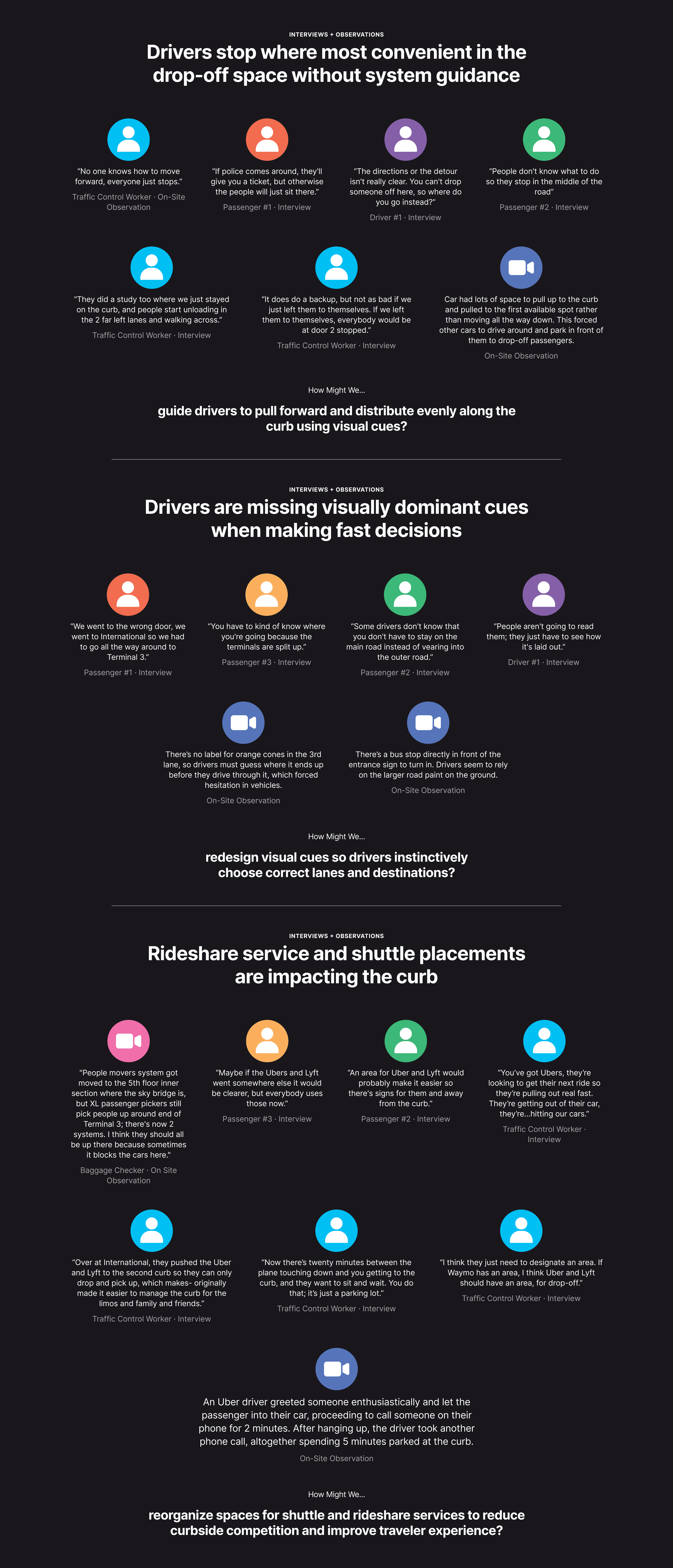 On three seperate days, I drove to SFO Airport Departures level and observed, majorly Terminal 3 and partially Terminal 1 and 2, for a couple hours at a time. One of my interviews with a very kind ground traffic control worker was on the second observational day. The remaining interviews with passengers and drivers were on various days, some on-site and some outside of the area. For convenience, I’ve highlighted the major quotes and where they’ve come from corresponding to 3 out of 5 total insights I gained that contributed to the final UI solutions. For further insights and details, feel free to view the slide decks below.