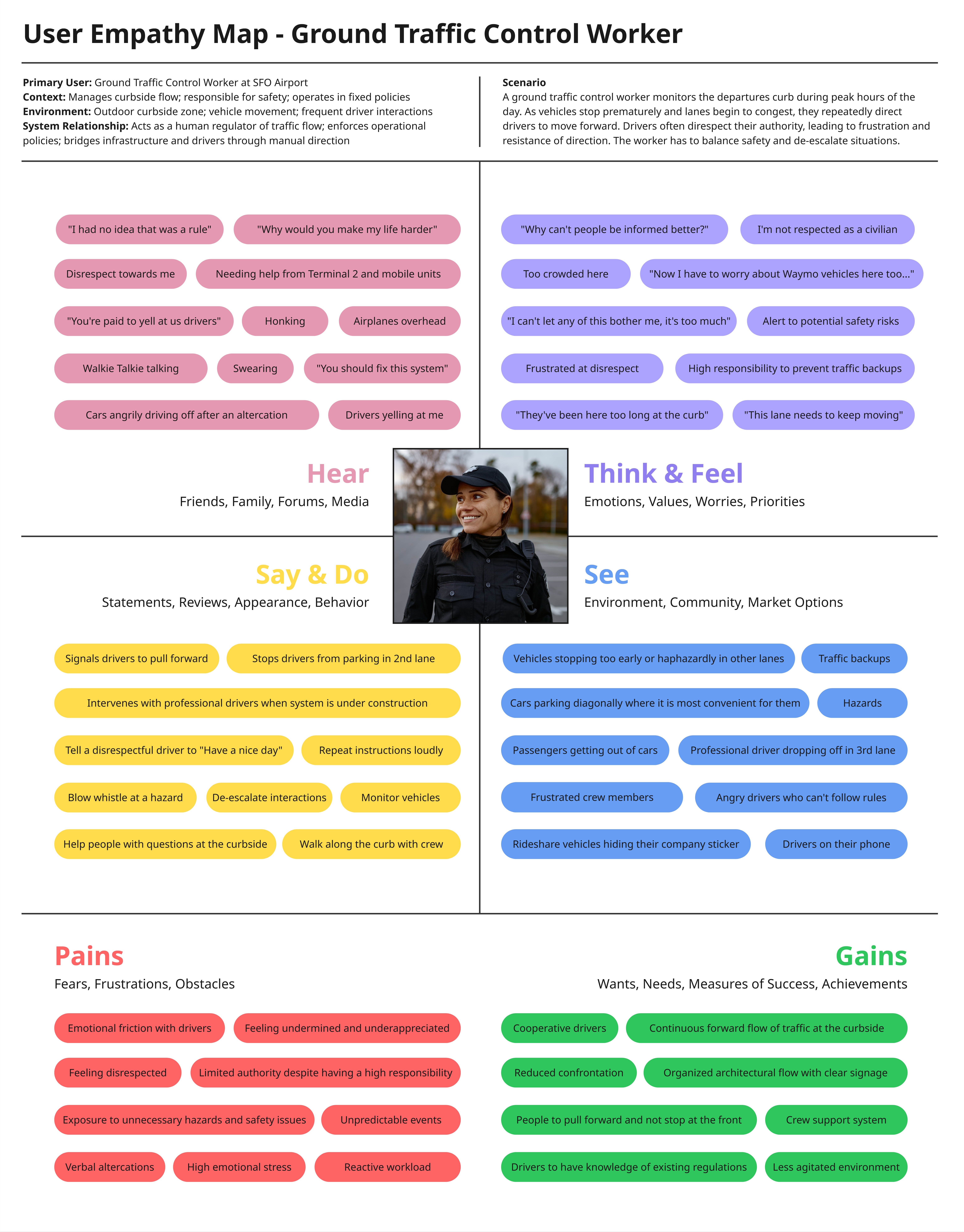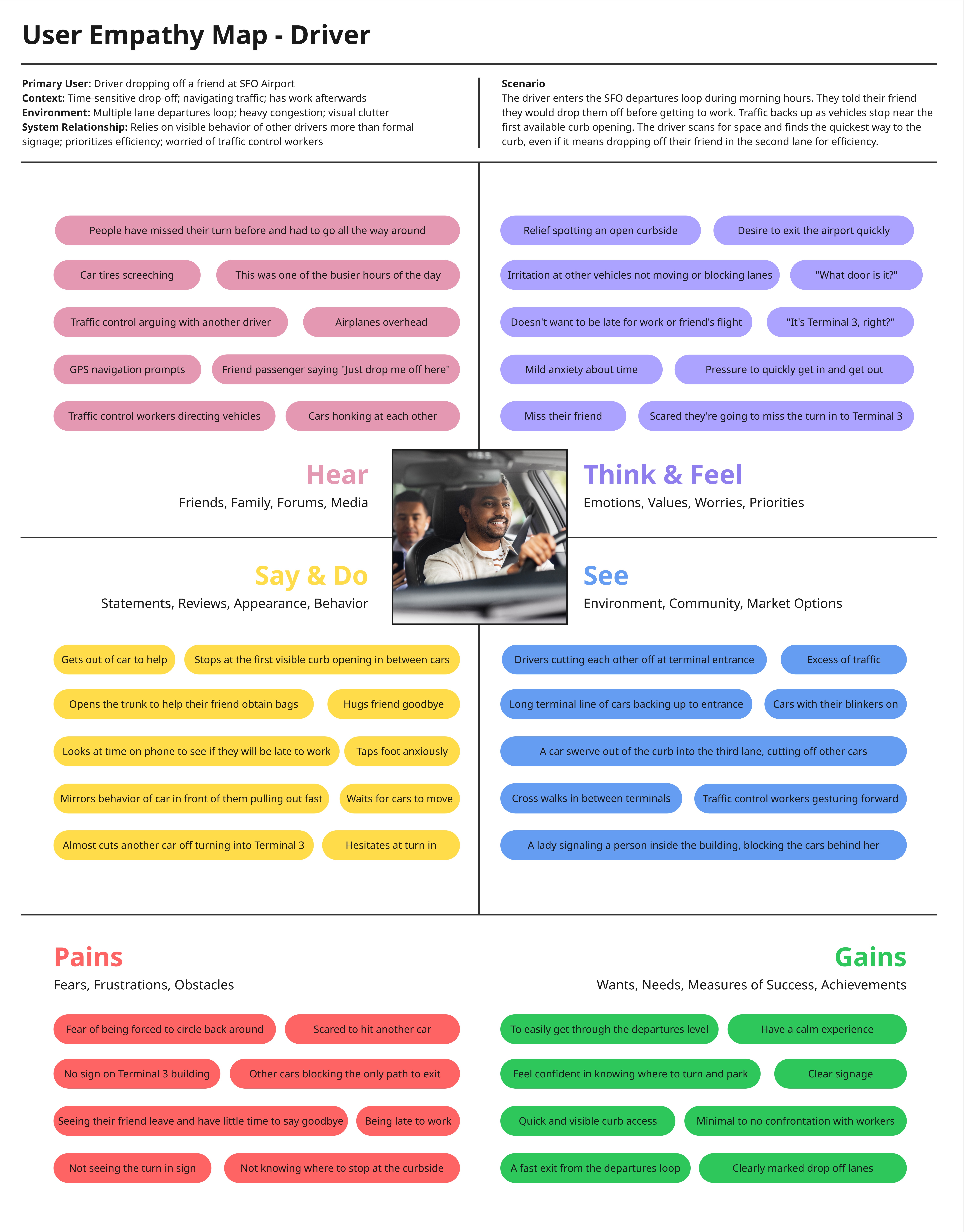 Synthesizing data from interviews and observations helped formulate a user empathy map for both a driver and a worker. To understand what they hear, feel, think, say, do, and see impacts their goals for a system and the pain points that they currently face. This narrows down the problems we need to solve to account for both sides of the system.