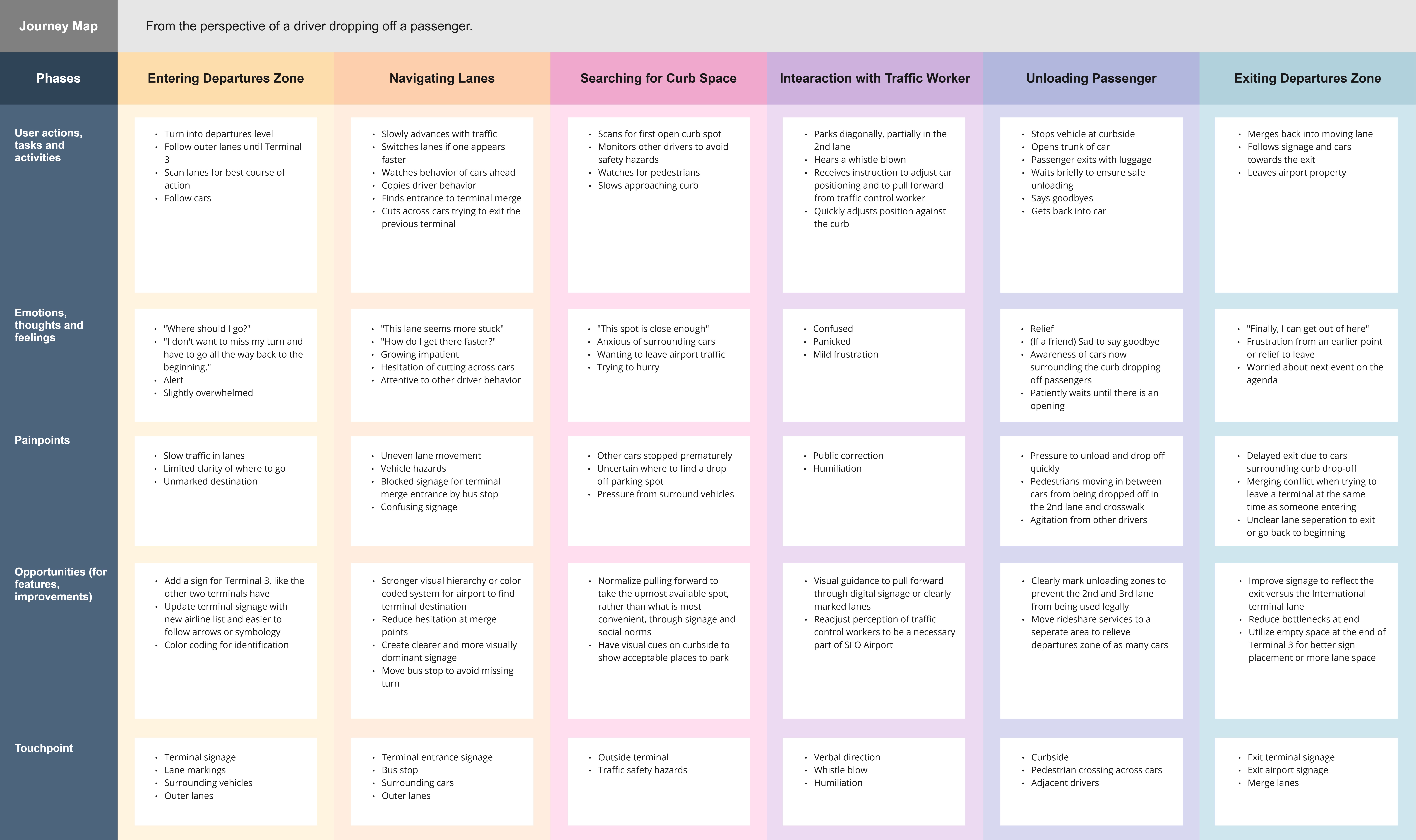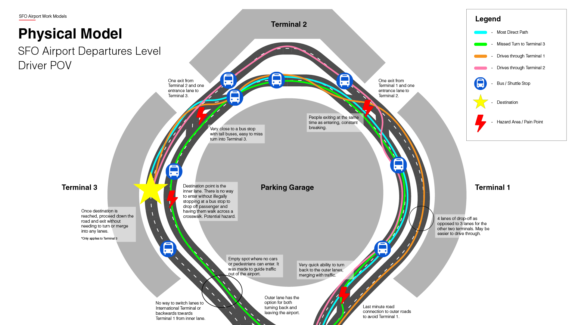 During the second phase where designing started to take place, I had been torn between multiple insights regarding a need for visual guidance on the curb, on the lanes, and a seperate issue regarding rideshare services and other shuttles or bus stops needing to be rellocated according to the ground traffic control worker I interviewed as well as a baggage checker who noticed the traffic delays caused when a passenger XL shuttle is placed at Terminal 3 rather than up in the sky bridge and parking lot structure where the rest of them reside. My decision brought me to addressing vehicle types within my design for a potential area change for these drivers. If the project continued further and I had connected with SFO Airport, the decision to change architecture would fall into their hands, so I learned to focus on only what I could fix now for the time being.