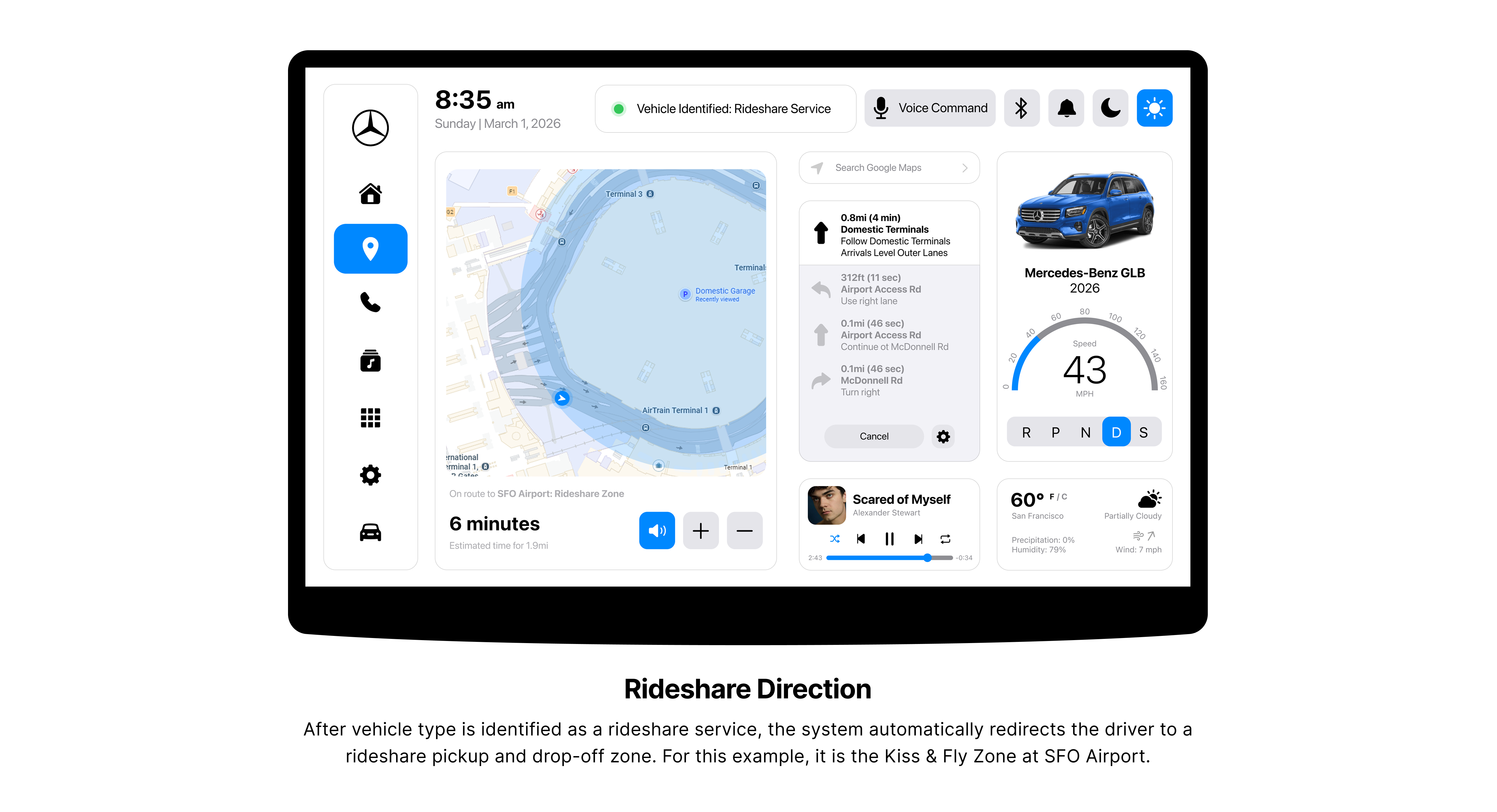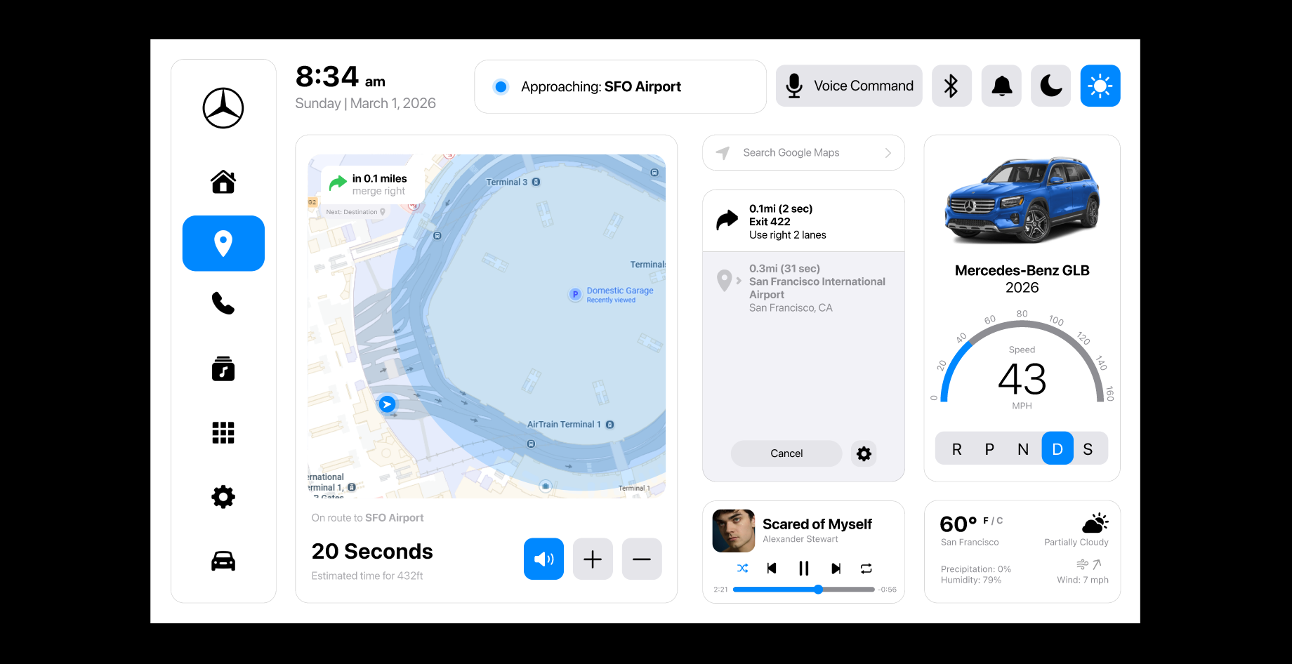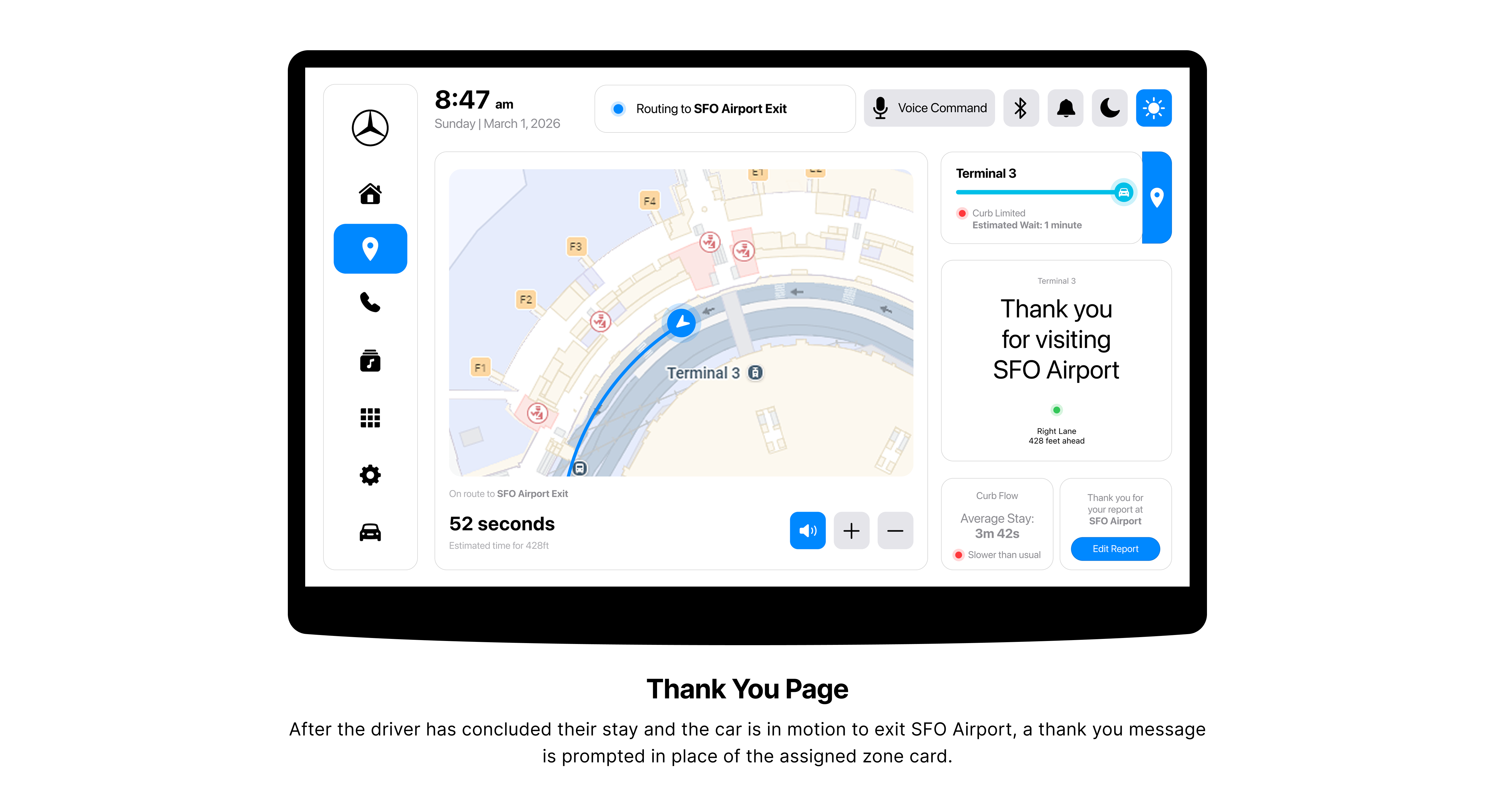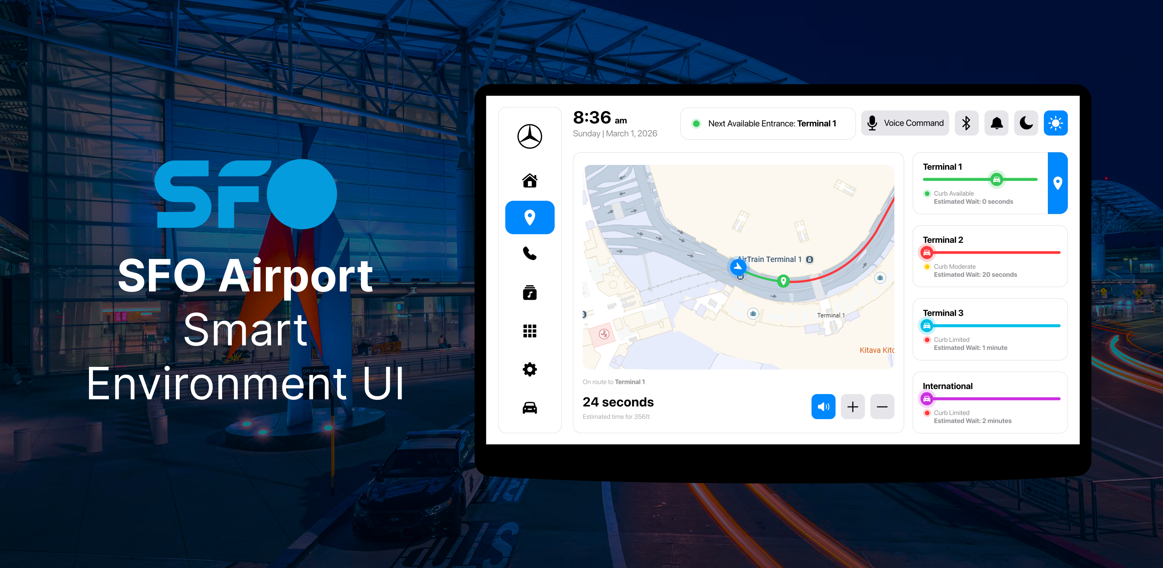 This is a working Figma prototype of SFO Airport’s potential UI that would integrate into existing car dashboards and navigation mapping software. Most screens are automatic, but some require touch to continue with the process. Please keep in mind not every feature is available. It is primarily designed to test a full process of entering and exiting the departures level terminal experience.