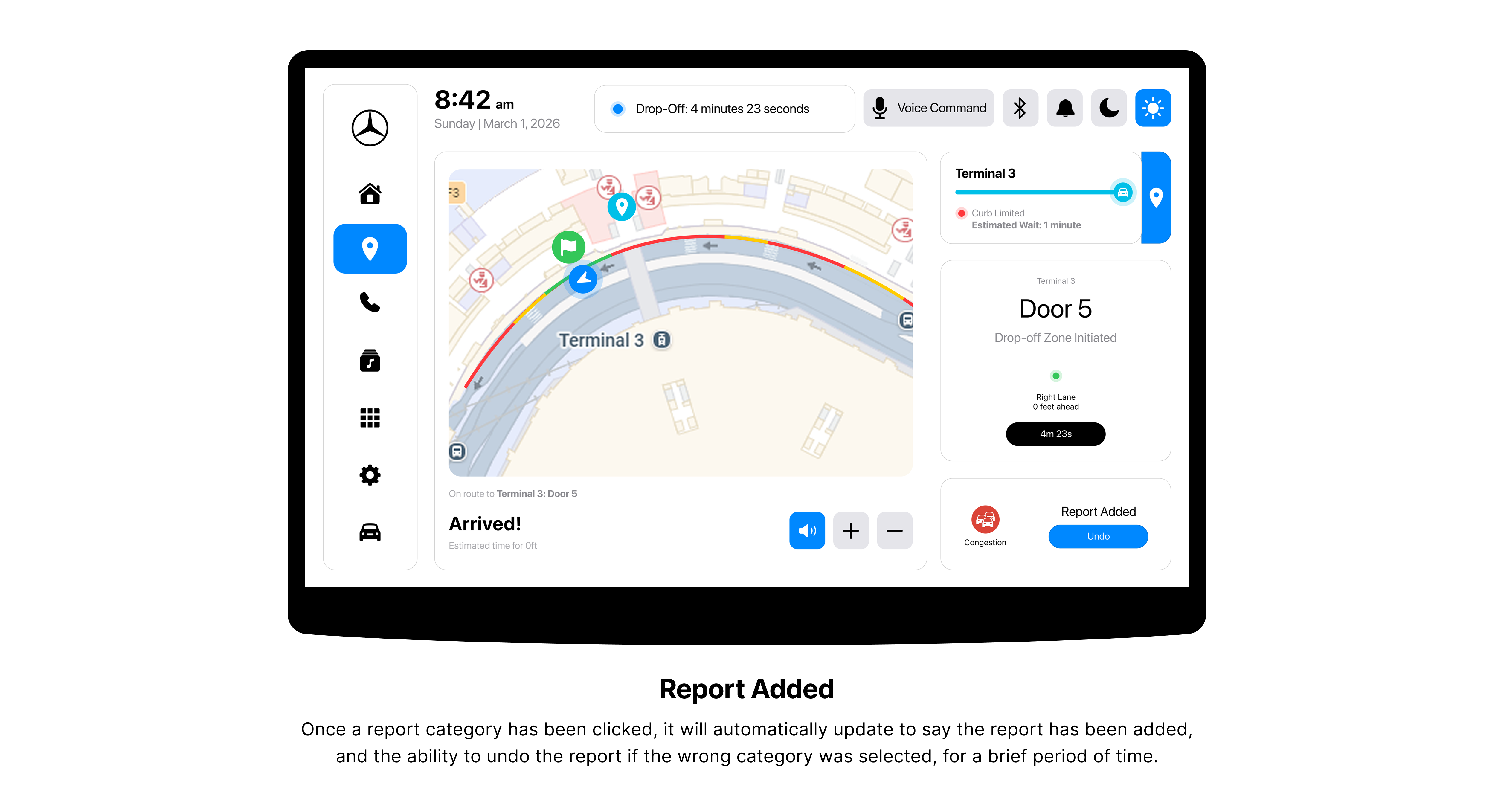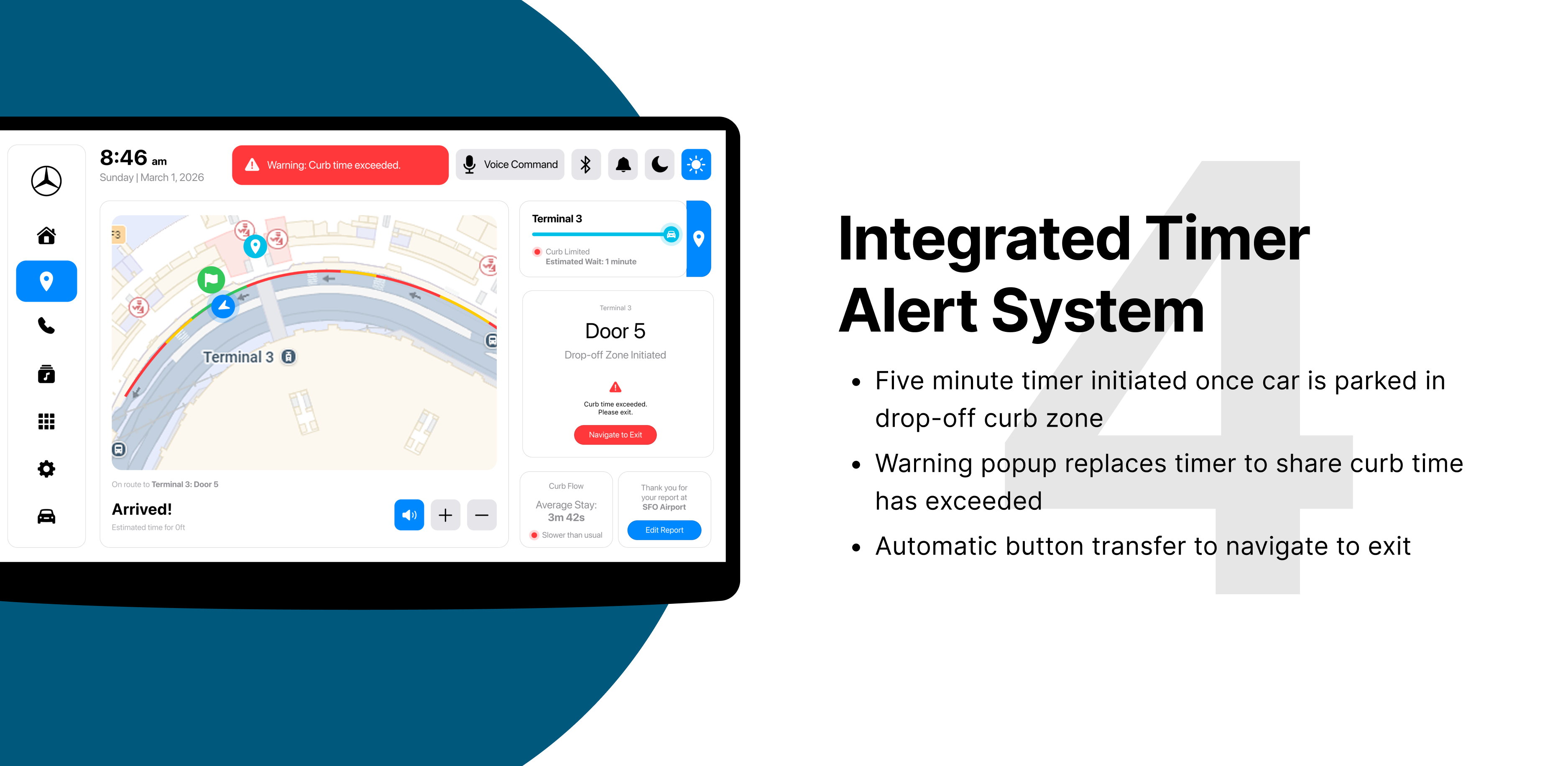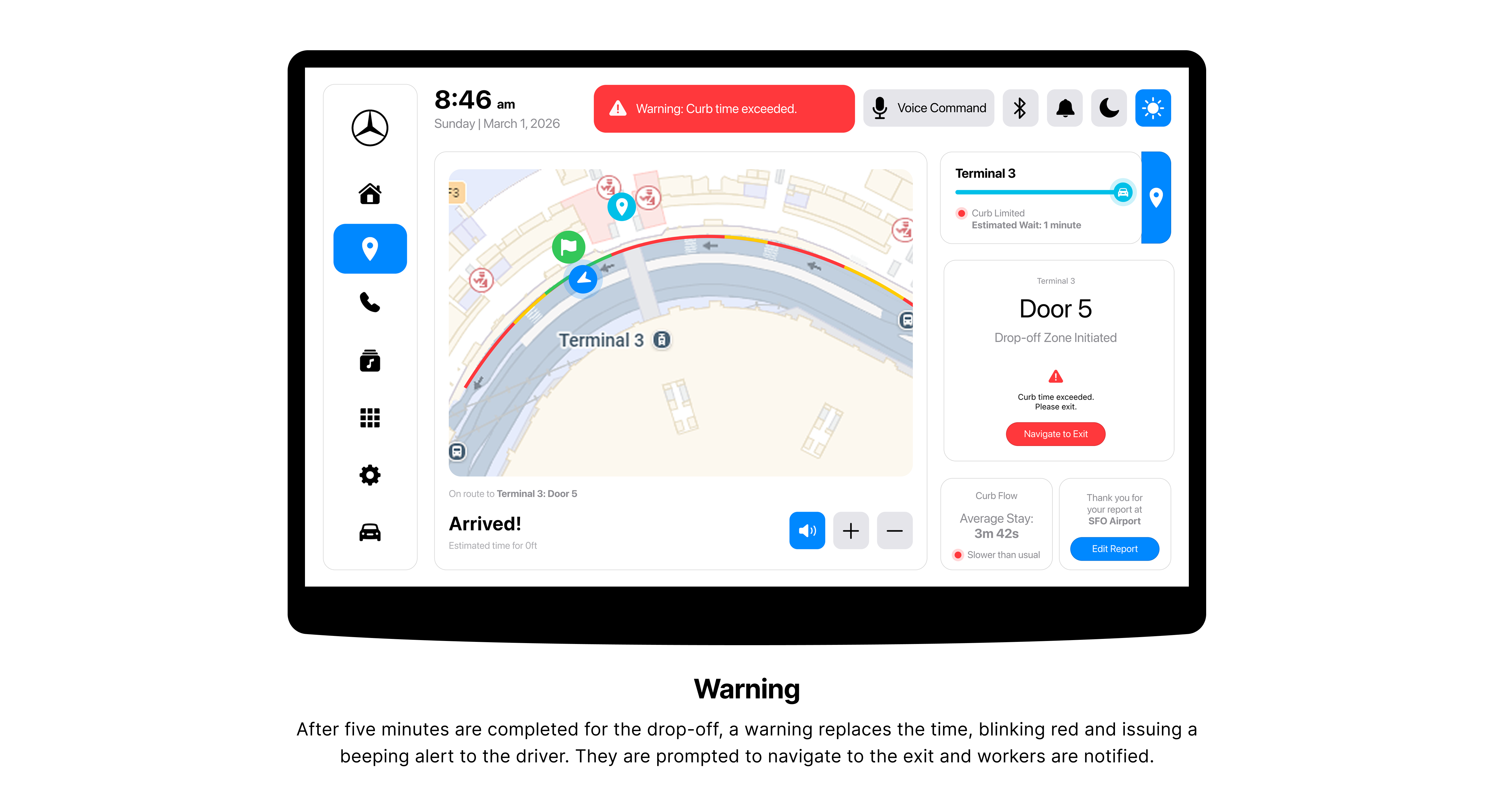 Availability can also be estimated and this will give information to the driver that a second lane drop-off may be the most viable. A timer system is also implemented within the map software and car dashboard UI to grant five minutes of drop-off time. If time is exceeded, the ground traffic control workers and drivers are both notified, warning the driver and prompting them to exit the SFO Airport.