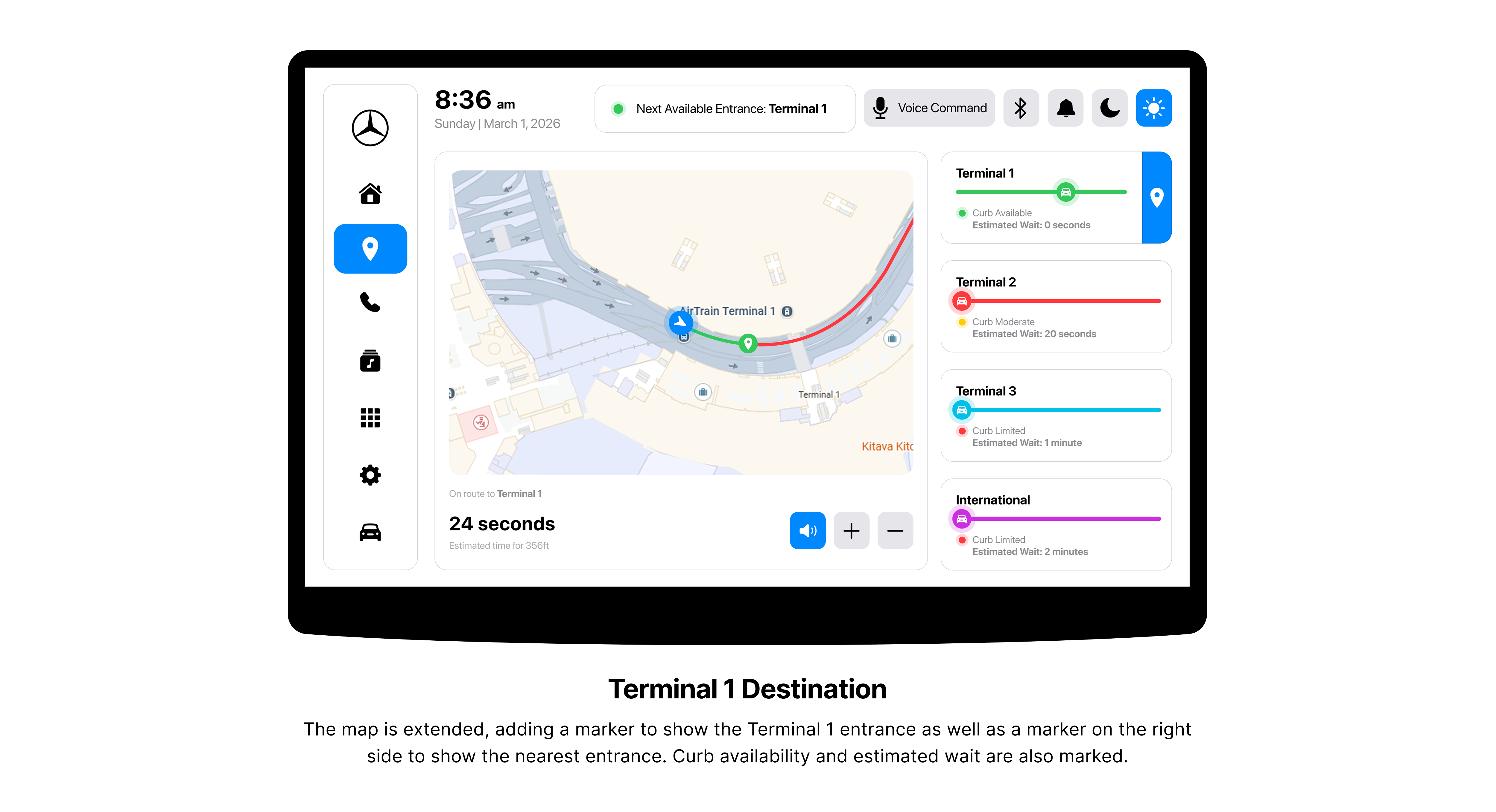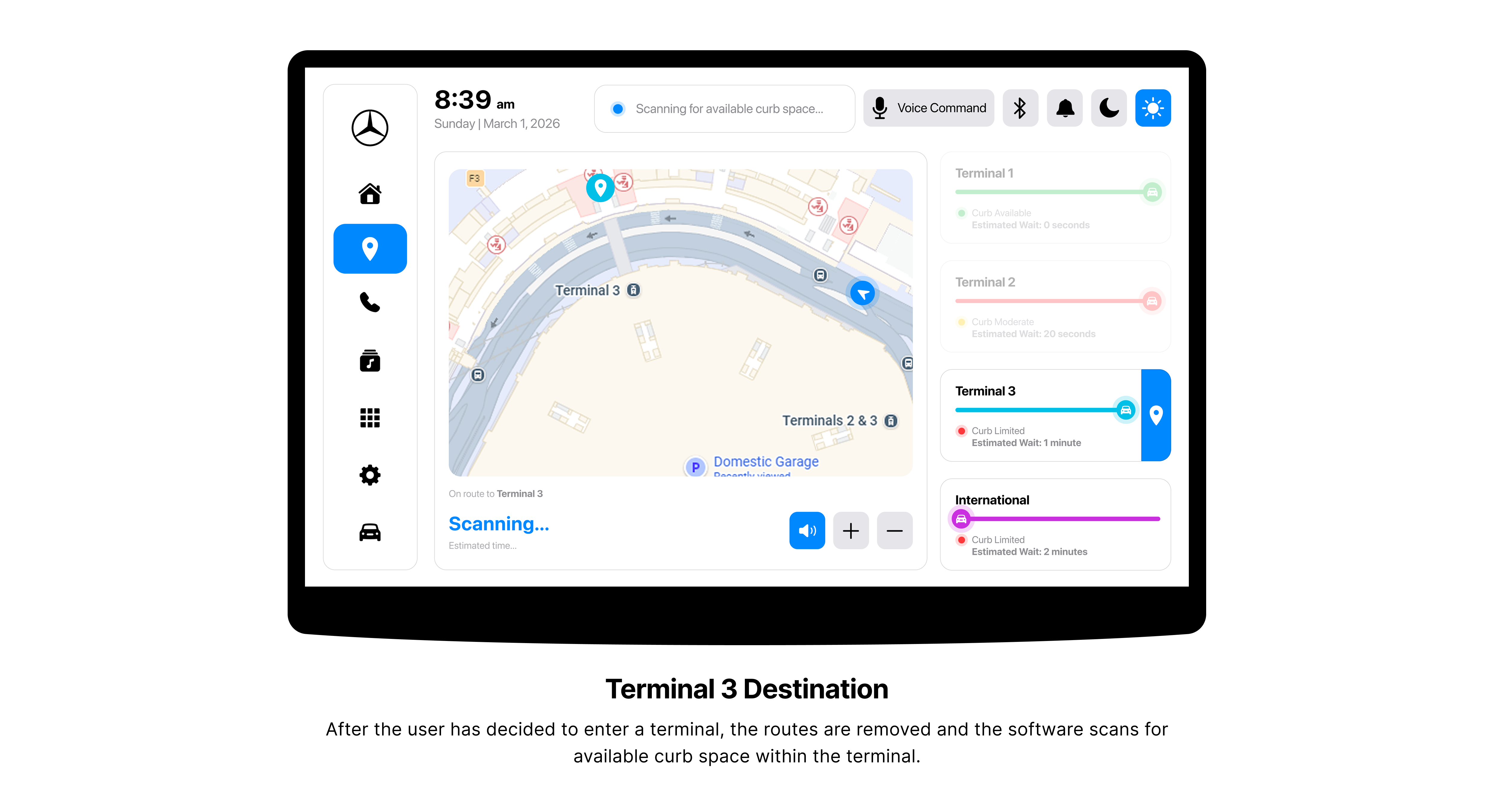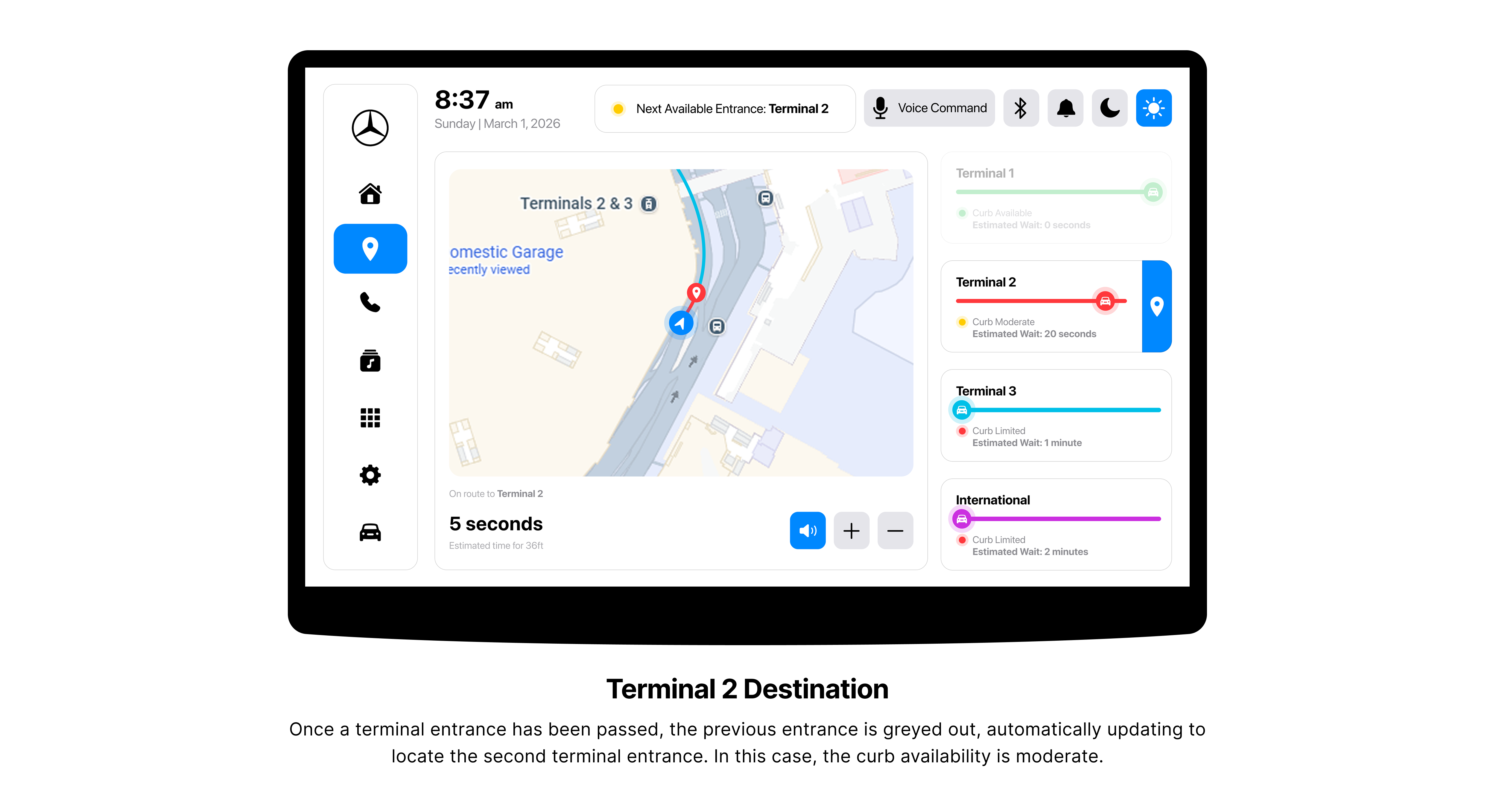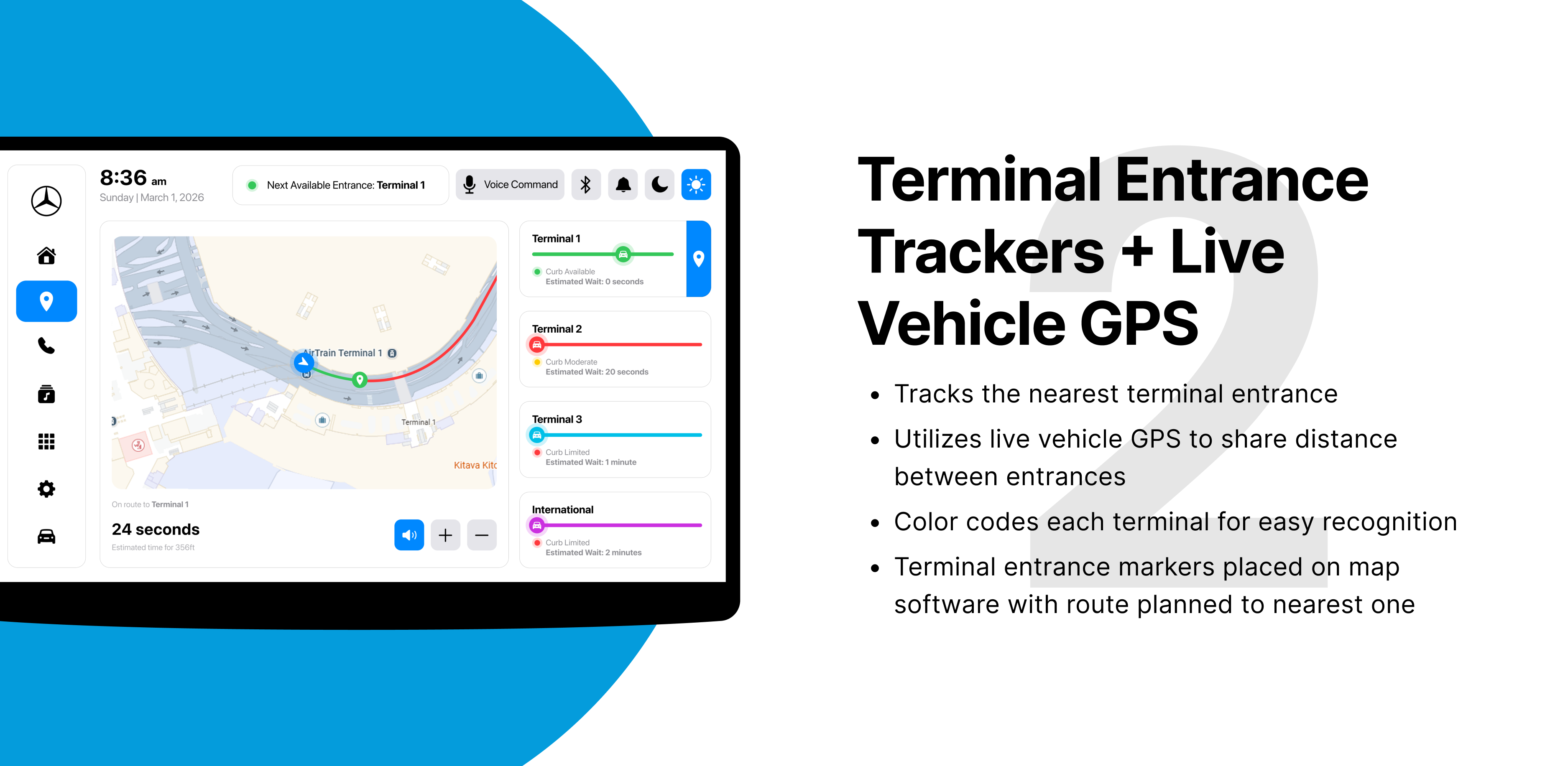 Drivers need easy access to terminal entrance points and curb access to improve the efficiency of the system. Integrating trackers into the structural entrances and syncing with vehicle GPS tracking allows the user to know how far they are from the nearest tracker, greying it out when a sensor is passed.