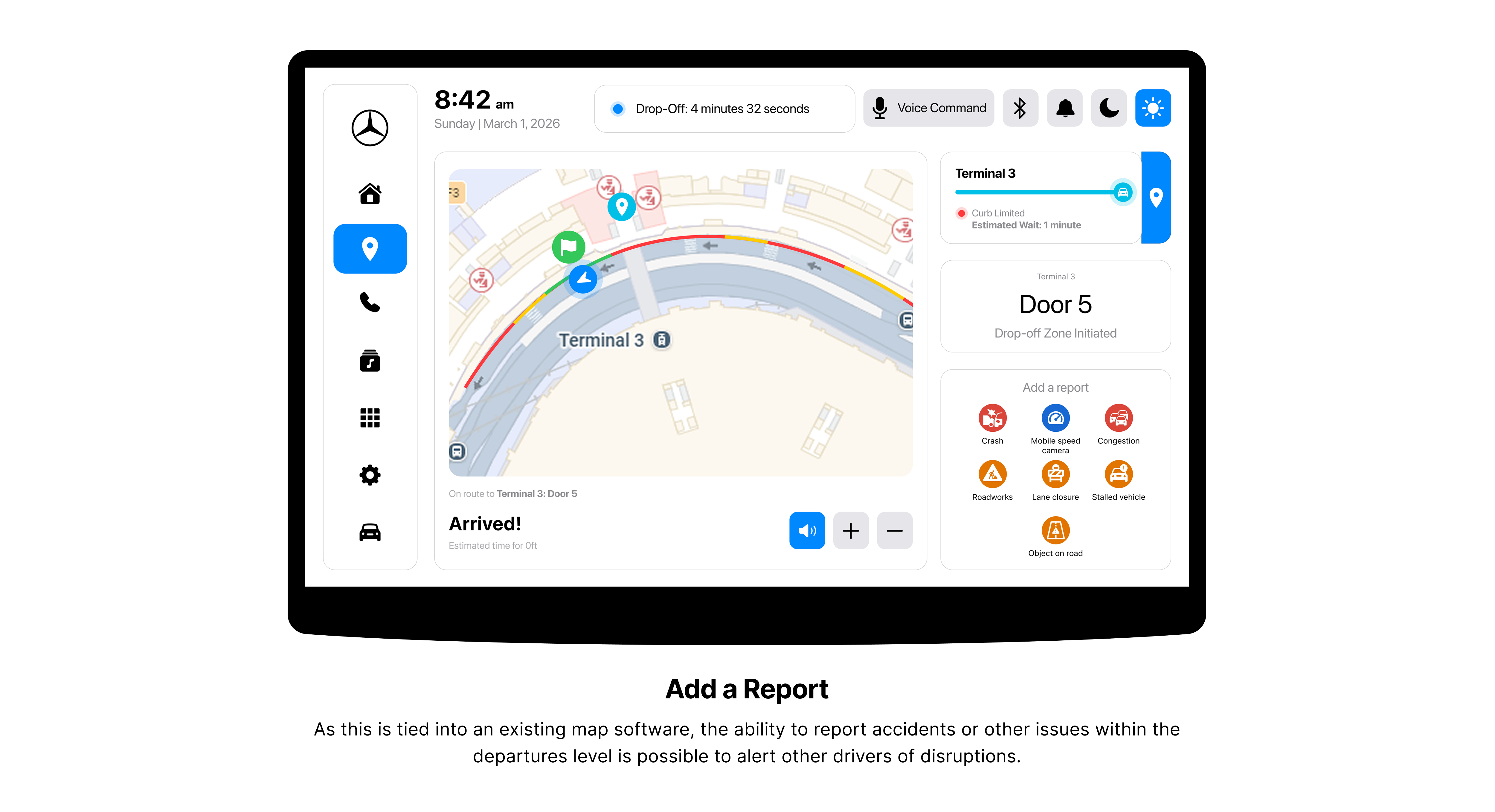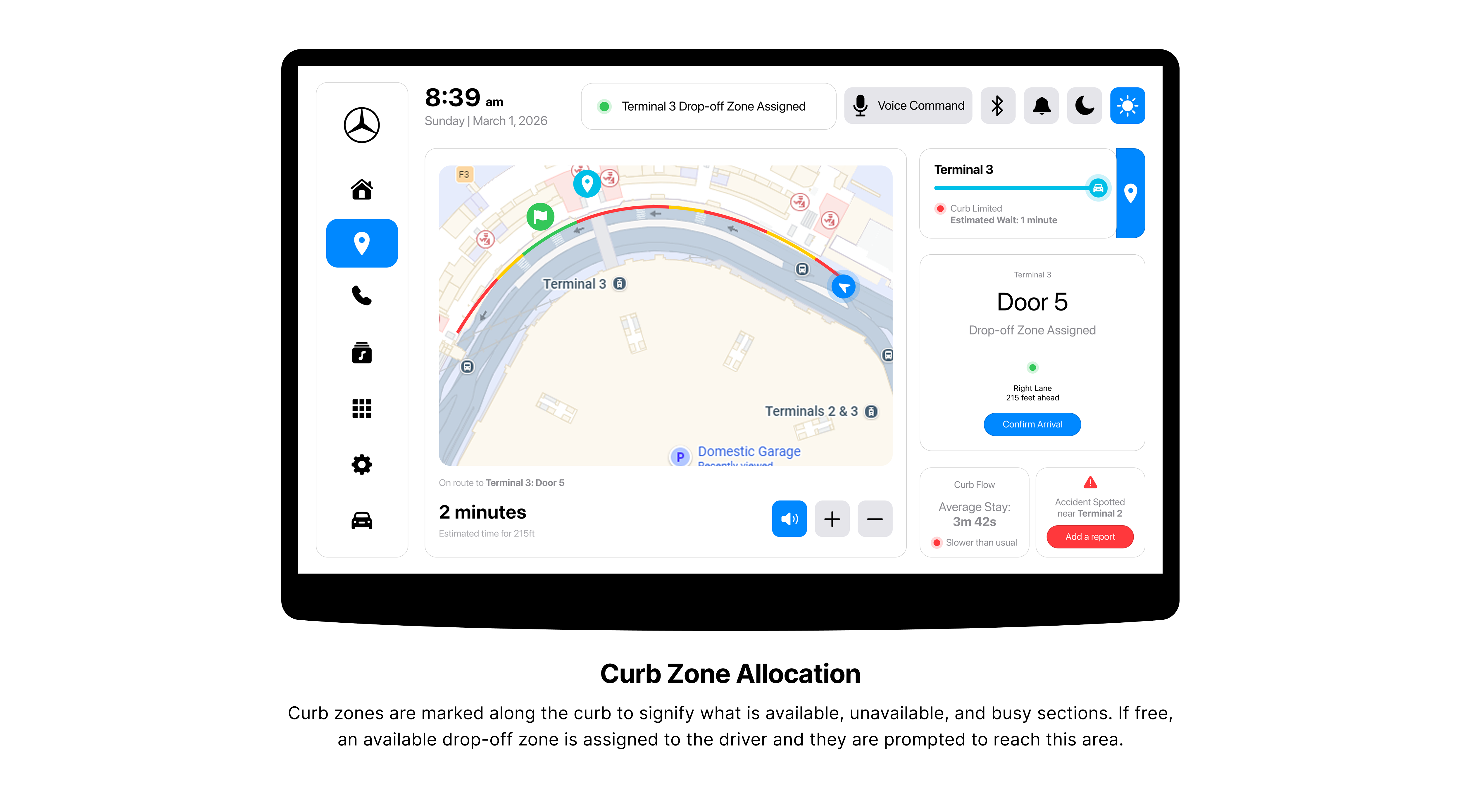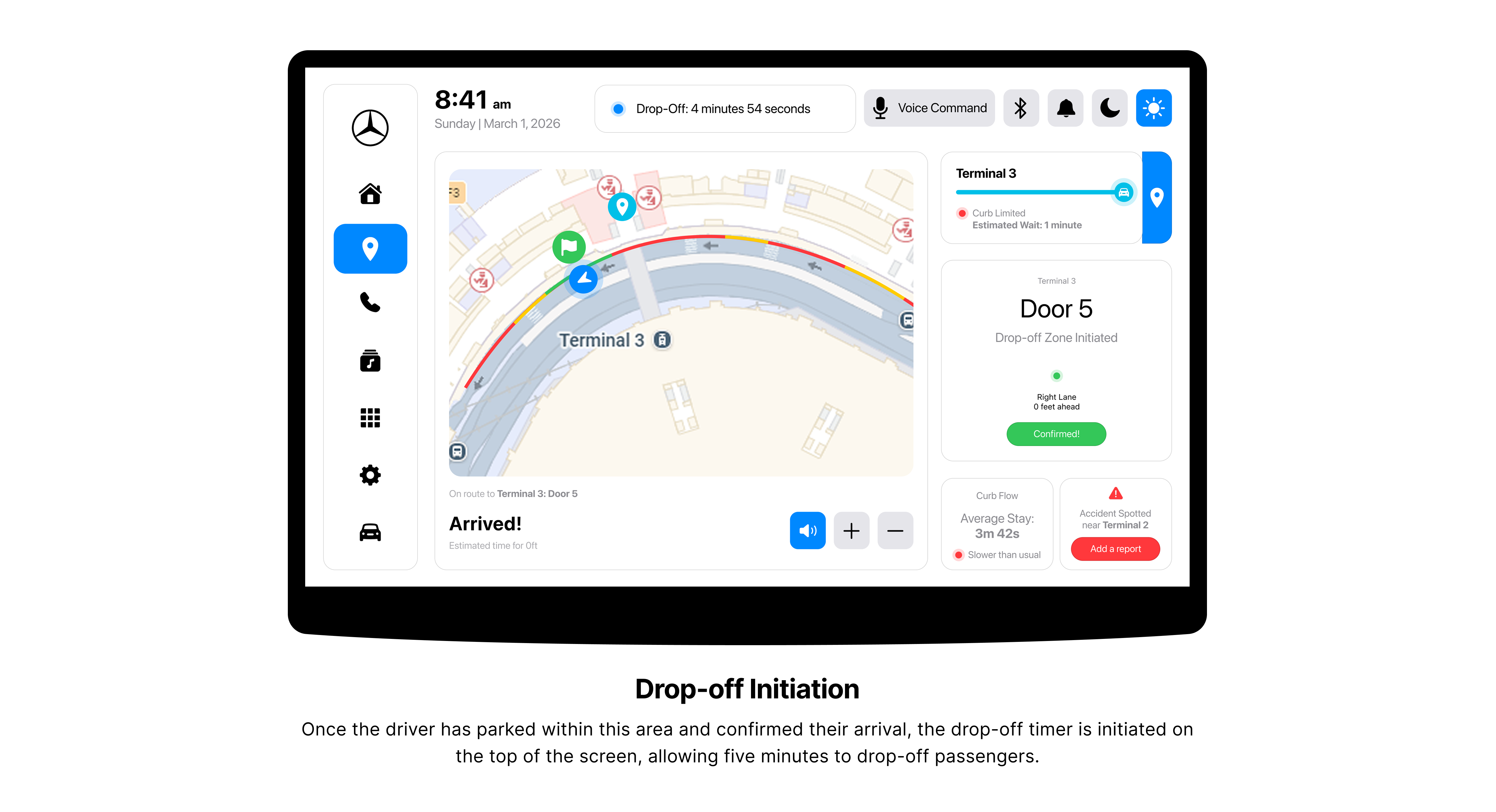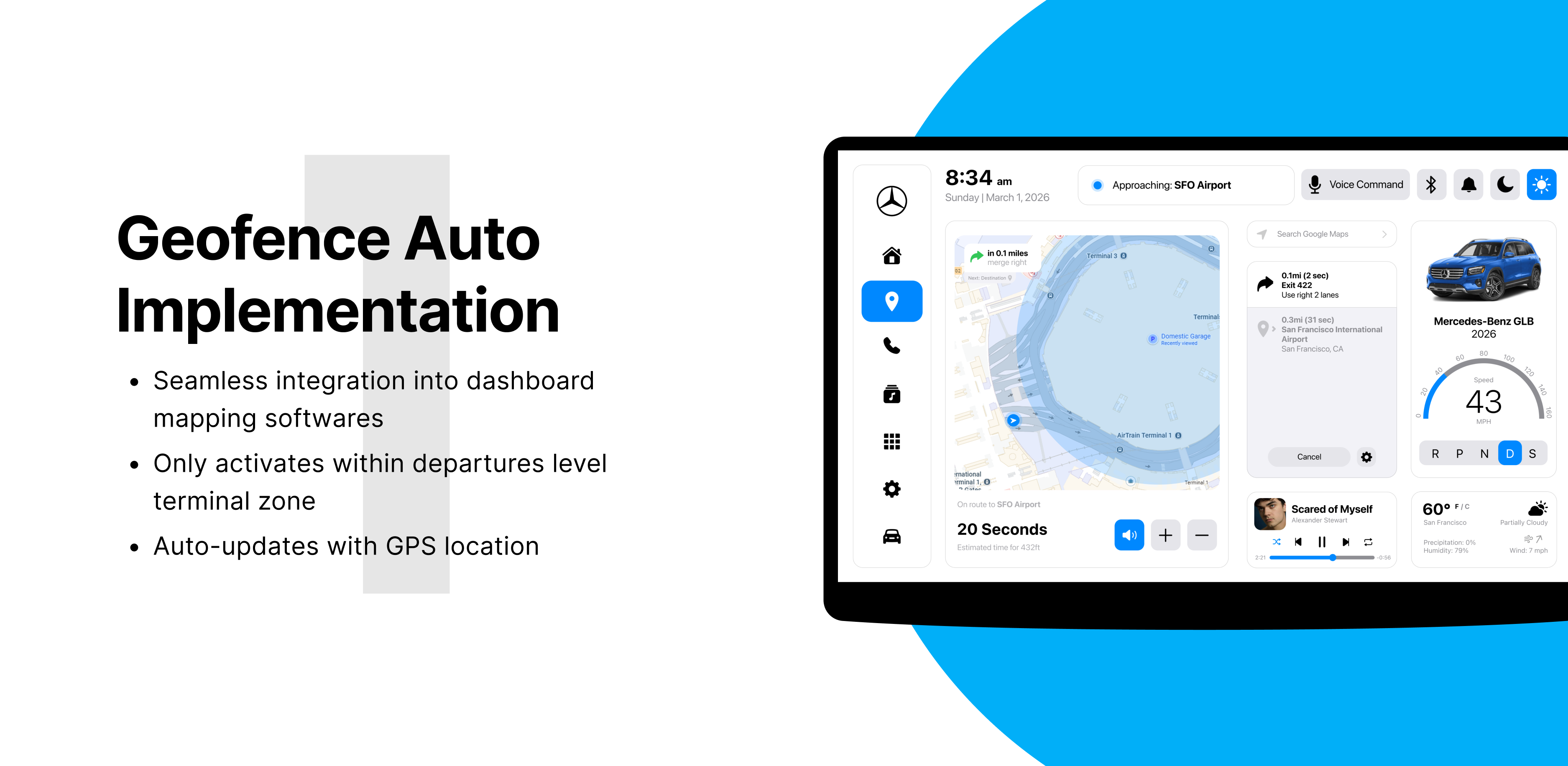 Drivers need easy access to terminal entrance points and curb access to improve the efficiency of the system. Integrating trackers into the structural entrances and syncing with vehicle GPS tracking allows the user to know how far they are from the nearest tracker, greying it out when a sensor is passed.
