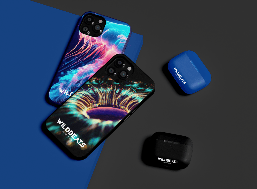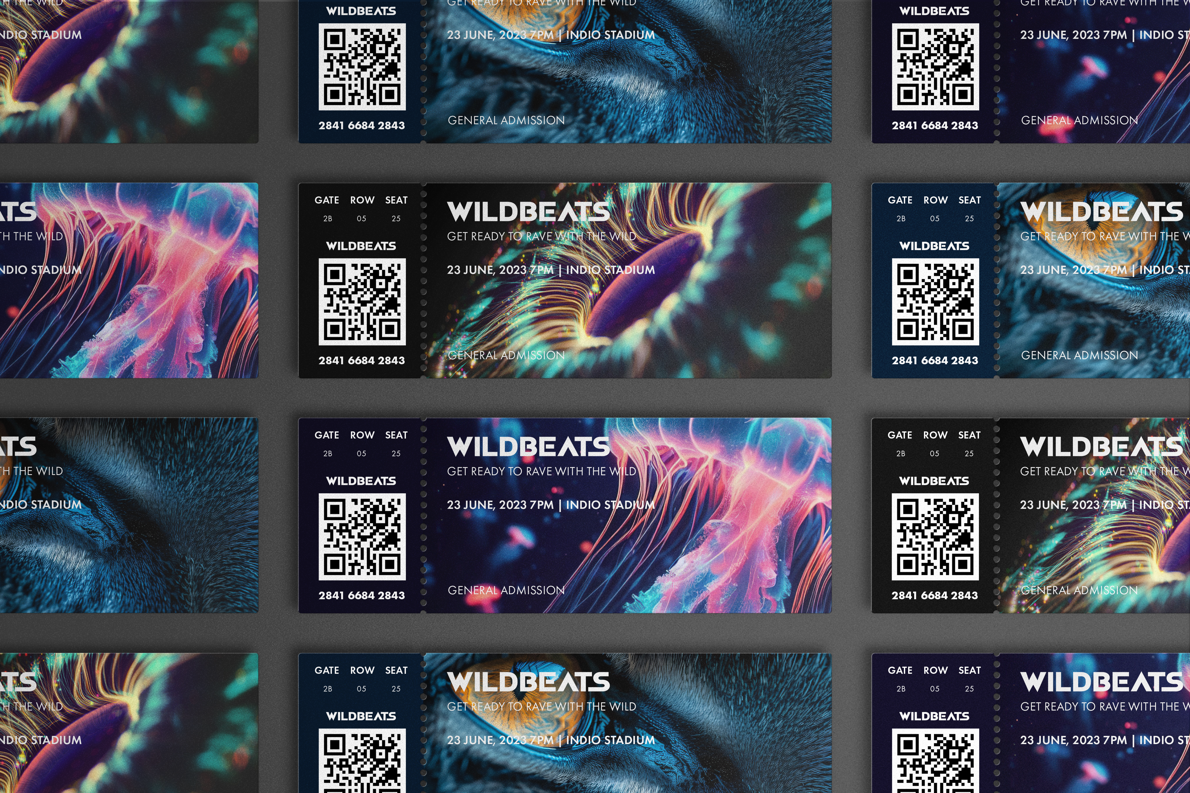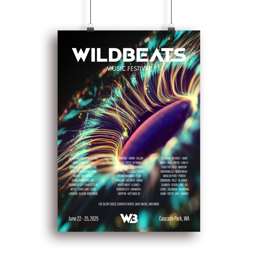 My approach is to craft a visual identity for WILDBEATS that fully captures the combination of nature and rave culture, while adhering to environmental sustainability. I created a bold wordmark and logomark to be memorable in short and long forms. By pushing bold, energetic visuals with earthy and animalistic textures, I centered my design around three abstract sets of imagery that evoke a sense of curiosity and style. For deliverables, I made phone cases, posters, lanyards, vinyls, and an app for WILDBEATS attendees to purchase tickets and view bands. This branding reinforces the festival’s identity as a place for freedom, creativity, and environmental awareness in an unforgettable, outdoor experience.